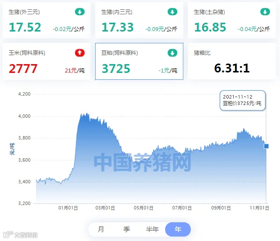 今日豆粕(饲料原料)均价3725元/吨,今日饲料原料价格较昨日下跌了1元/吨;
