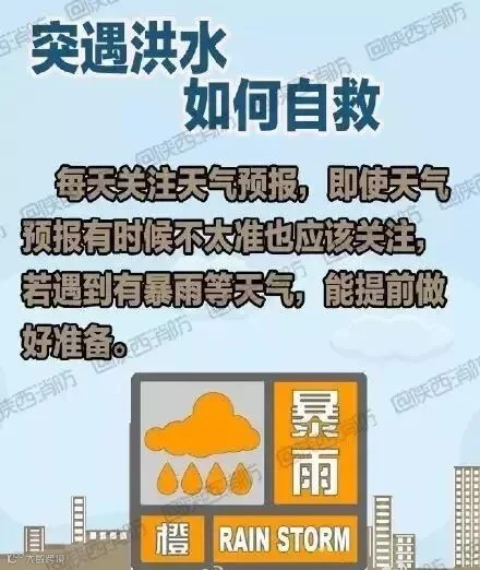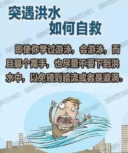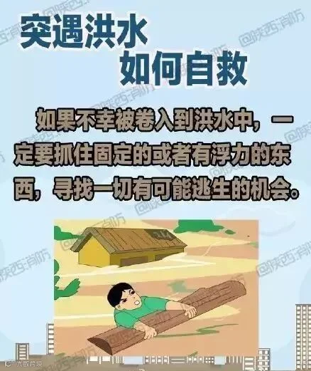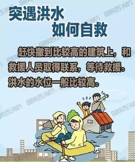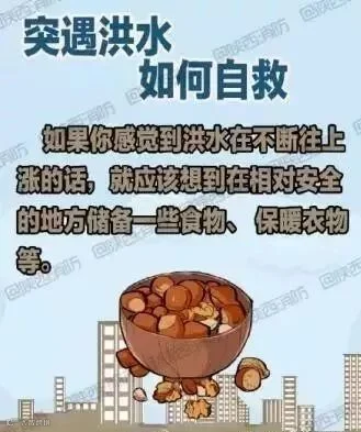 【遇洪水如何自救】①迅速爬上高层建筑避险,及时报警,与救援部门取得联系;②搜集木盆、木块等漂浮材料加工为救生设备以备急需;③如洪水不断上涨,应在楼上储备一些食物、饮用水、 保暖衣物等;④准备可发出求救信号的东西,如手电筒、应急灯、哨子、鲜艳的床单、镜子等。