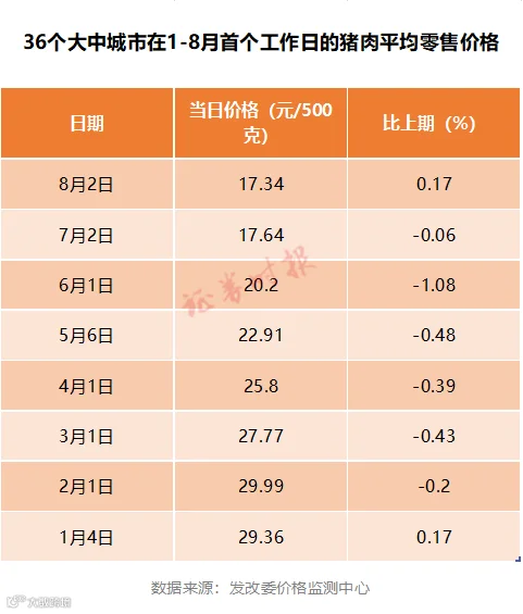 记者还注意到,从8月初到8月末,发改委价格监测中心统计的猪肉平均零售价格从8月2日的17.34元/500克降至8月31日的16.67元/500克。而从今年以来每月首个工作日的猪肉平均零售价格来看,猪肉价格从1月4日的29.36元/500克降至8月2日的17.34元/500克。