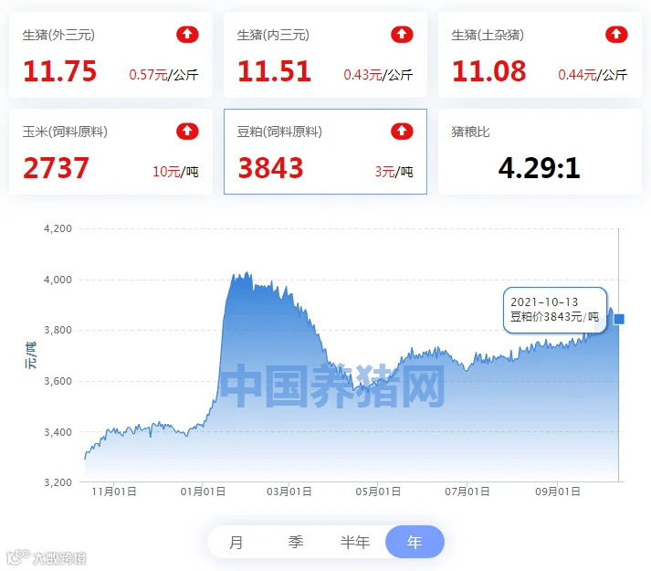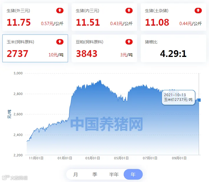2021年10月13日(星期三),中国养猪网“养猪数据中心”监测的生猪价格以及饲料原料价格明细如下: