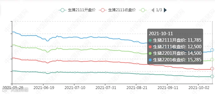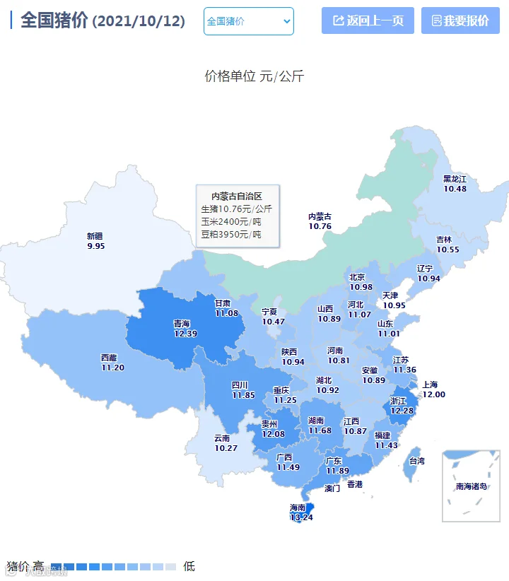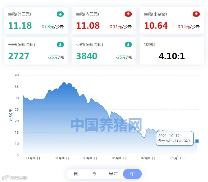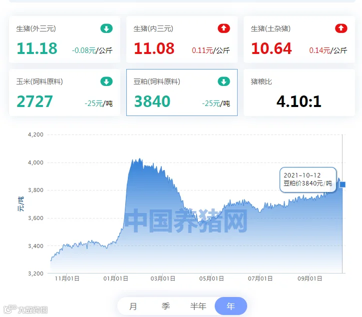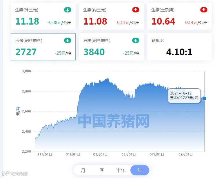 2021年10月12日(星期二),中国养猪网“养猪数据中心”监测的生猪价格以及饲料原料价格明细如下: