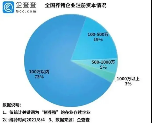 注册资本上,注册资本在100万以内的养猪企业是该市场的主力军,占据了总量的73%,而注册资本在1000万以上的,仅占3%。