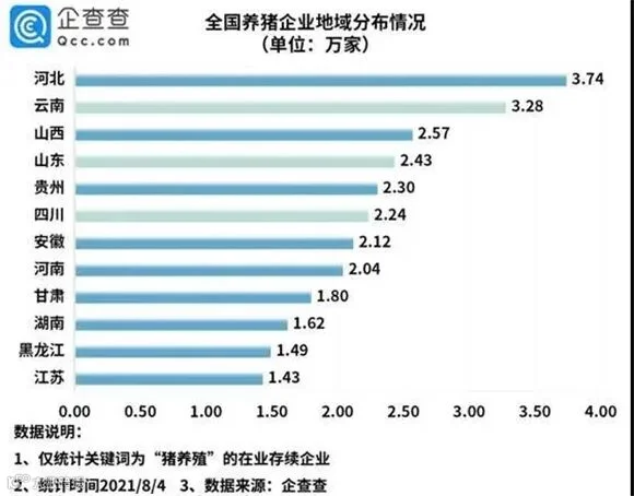 目前我国现存养猪企业37.65万家,从地域分布来看,河北、云南和山西,分别以3.74万家、3.28万家和2.57万家位列前三。