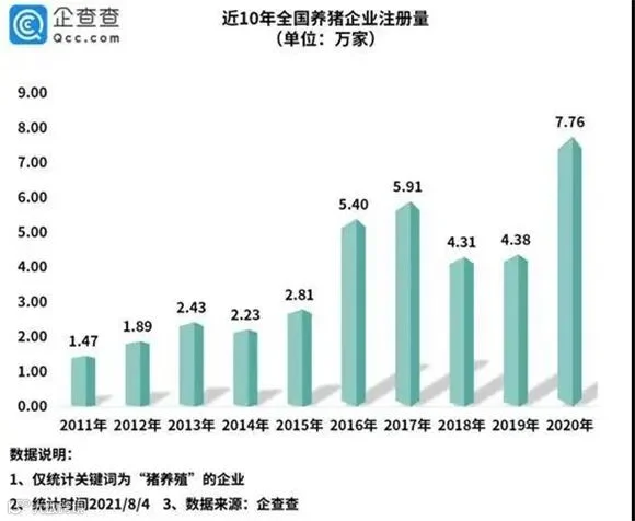 刚刚过去的7月,灾情叠加疫情持续牵动市场神经,特别是养猪大省河南的暴雨洪灾,不仅造成重大人员伤亡,也对全国畜牧行业带来一定不利影响,据农业农村部的数据监测,7月末全国活猪均价同比下降近六成。企查查数据显示,目前我国现存养猪企业37.65万家,从地域分布来看,河北、云南和山西,分别以3.74万家、3.28万家和2.57万家位列前三。从年注册量来看,2020年相关企业注册量达7.76万家,同比增长77%;2021年上半年共新增2.6万家,同比下降31%。