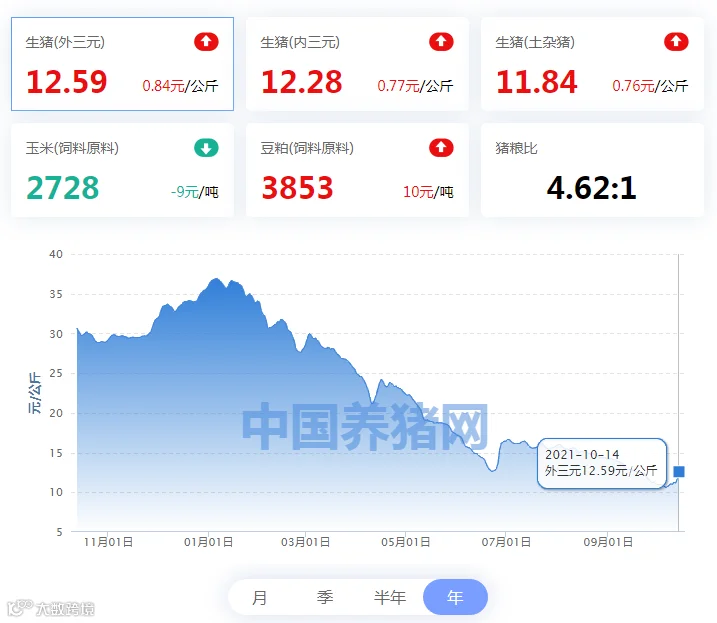 2021年10月14日(星期四),中国养猪网“养猪数据中心”监测的生猪价格以及饲料原料价格明细如下: