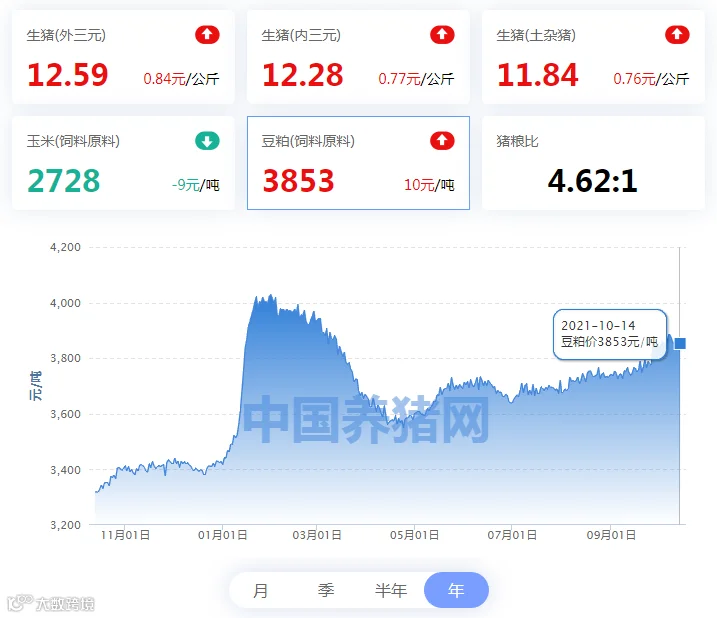 今日豆粕(饲料原料)均价3853元/吨,今日饲料原料价格价格较昨日上涨了10元/吨;