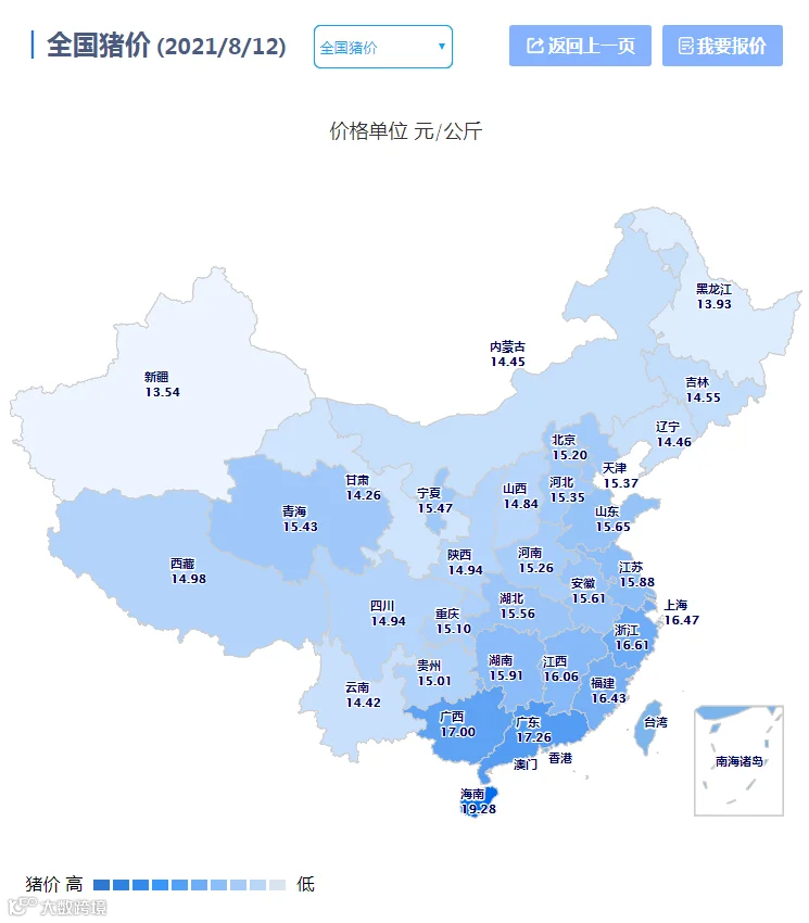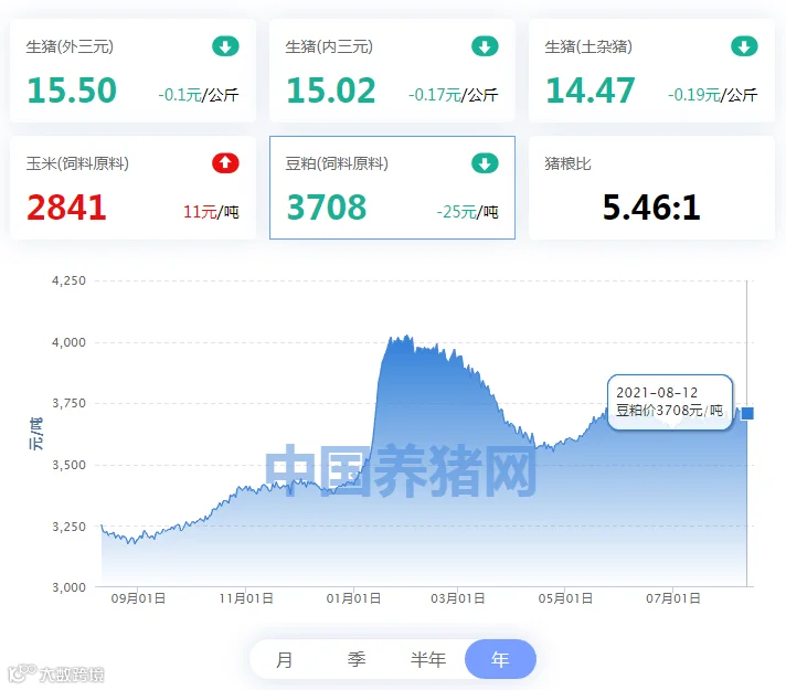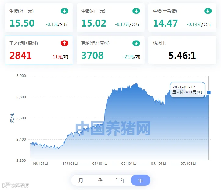 2021年08月12日(星期四),中国养猪网猪价系统平台监测的生猪价格以及饲料原料价格明细如下: