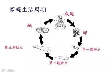 苍蝇的一生要经过卵、幼虫(蛆)、蛹、成虫,四个时期,受温度,湿度变化因素四个时期需要5-12天。