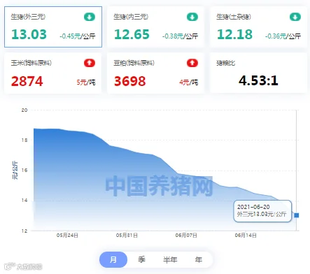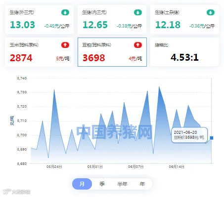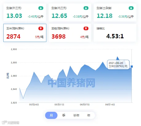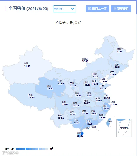 2021年06月20日(星期日),中国养猪网猪价系统平台监测的生猪价格以及饲料原料价格明细如下: