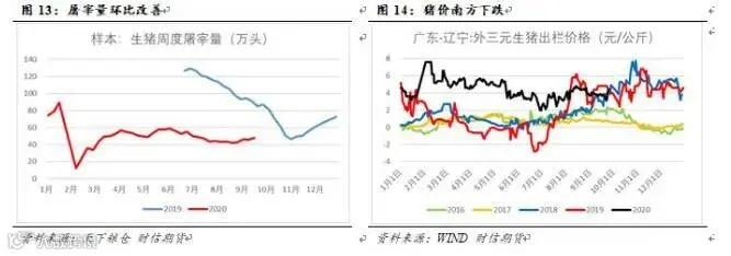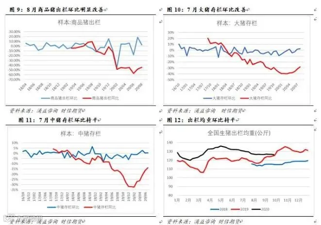 10月将处于下跌阶段。供应端:8月底大猪存栏环比改善但幅度有限意味着9月出栏改善,北方存栏恢复较快区出栏积极性提升;8月底中猪存栏环比继续改善但幅度有限,意味着中期看10月商品猪出栏将持续改善,惜售心态将更一步弱化。需求端:季节性恢复短期出现,但受高价抑制和替代效应明显,鲜销订单中期还将维持弱势,实质转旺季在12月开始的春节前备货。9月下旬集团出栏目标完成,出栏将明显放量,价格弱势不变。10月需求改善程度将小于供给改善幅度,供需缺口形势有望边际改善,价格跌幅较9月会加大,北方猪价可能短期破30元/公斤。