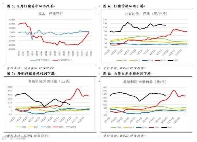 据涌益咨询数数据,8月小猪存栏量全国环比+2.33%,前值+2.21%,同比-0.31%,小猪存栏连续5个月环比改善,意味未来6个月后即10月前后生猪出栏量会有所改善。养殖户预期现在购买仔猪3月后出栏会因季节性需求较差和明年出栏明显改善导致大幅跌价等因素,实际出栏的养殖利润明显不及目前,同时目前北方产区仔猪供应量明显增加,集团外采仔猪减少,市场供需矛盾增加,采购者以观望情绪为主。后市仔猪供需矛盾短期难改,价格将继续承压下行。