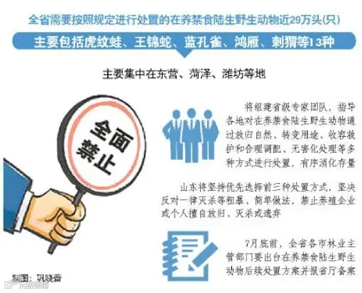 “将组建省级专家团队,指导各地对在养禁食陆生野生动物通过放归自然、转变用途、收容救护和合理调配、无害化处理等多种方式进行处置,有序消化存量。”省野生动植物保护站副站长韩云池介绍,山东将坚持优先选择前三种处置方式,具体处置工作将由县级林业主管部门具体操作实施,坚决反对一律灭杀等粗暴、简单做法,禁止养殖企业或个人擅自放归、灭杀或遗弃。7月底前,全省各市林业主管部门要出台在养禁食陆生野生动物后续处置方案并报省厅备案。