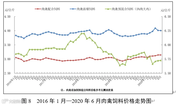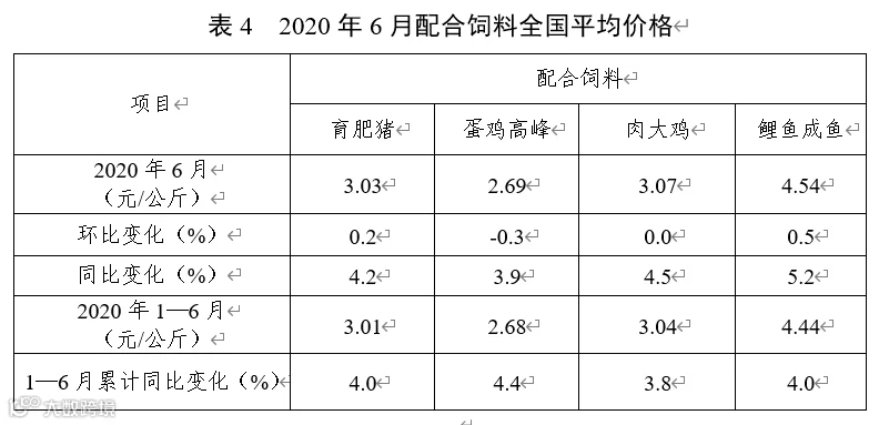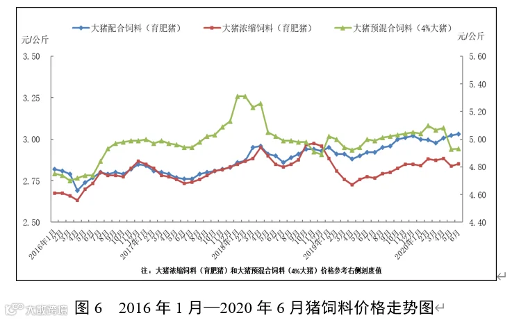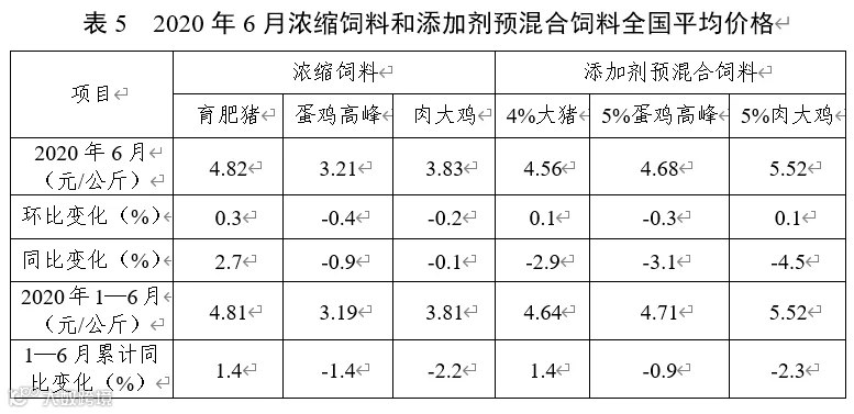 6月份,因玉米价格持续上行,带动麸皮等能量饲料原料价格上涨,配合饲料价格普遍小幅上涨,主要饲料品种价格比上年同期上涨3.9—5.2个百分点。而豆粕等蛋白饲料原料价格下行趋稳,除育肥猪浓缩料同比上涨外,其他浓缩饲料、预混合饲料同比均小幅下降。