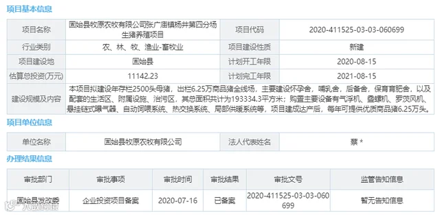 11、7月16日,据河南省投资项目在线审批监管平台发布,总投资1.59亿元的牧原股份固始县生猪养殖项目已获固始县发改委备案,计划2021年完工。