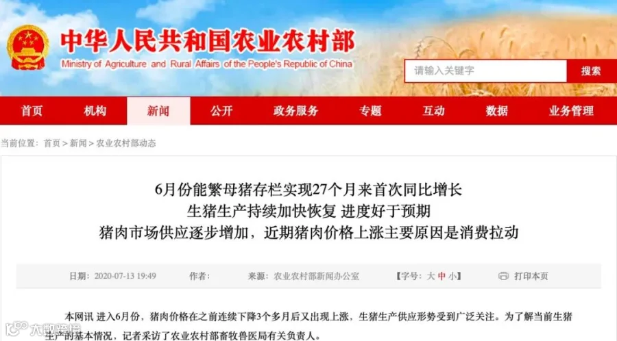 7月16日,国务院新闻办公室上午10时举行新闻发布会,国家统计局新闻发言人、国民经济综合统计司司长刘爱华答记者问时提到,从二季度末情况看,生猪存栏数已经持续三个季度环比增长,生猪生产在逐步恢复。但同时生猪生产仍然面临一定困难,包括洪涝灾害对部分地区生猪出栏造成了一定影响,6月份数据已经有所体现,6月份猪肉环比价格涨幅转正,同比价格上涨81.6%,5月份为81.7%,5、6月涨幅基本持平。总体来看产能恢复明显,产能恢复必将对下一阶段猪肉价格影响逐渐体现出来。