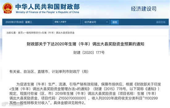 近日,财政部下达2020年生猪(牛羊)调出大县奖励资金预算的通知,通知要求加强对生猪(牛羊)调出大县奖励资金的监督管理,切实提高资金使用效率,促进生猪(牛羊)生产流通和产业发展。