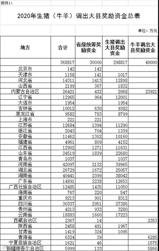 与此同时,通知公布2020年生猪(牛羊)调出大县奖励资金、以及各省生猪调出大县名单。其中河南共计58个调出大县奖励4亿元、四川52个奖励2.74亿元、广东18个奖励1.26亿......