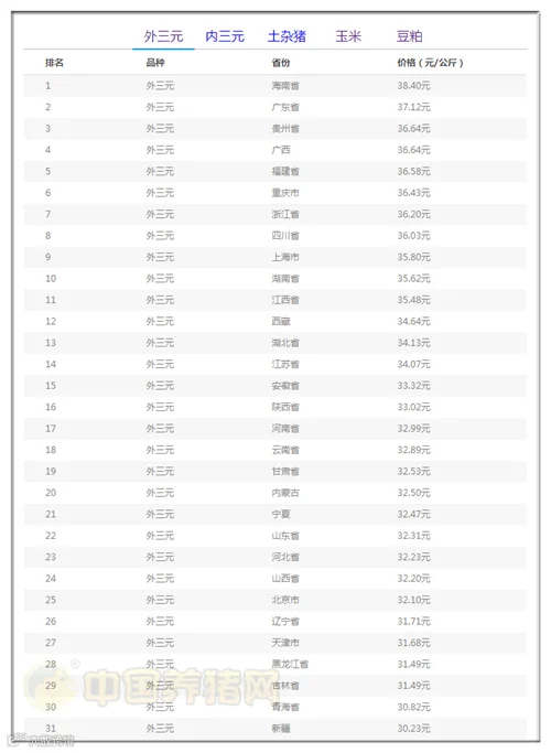 今日外三元生猪均价前十:(1)海南省外三元均价为38.40元/公斤、(2)广东省外三元均价为37.12元/公斤、(3)贵州省外三元均价为36.64元/公斤、(4)广西壮族自治区外三元为36.64元/公斤、(5)福建省外三元均价为36.58元/公斤、(6)重庆市外三元均价为36.43元/公斤、(7)浙江省外三元均价为36.20元/公斤、(8)四川省外三元均价为36.03元/公斤、(9)上海市外三元均价为35.80元/公斤、(10)湖南省外三元均价为35.62元/公斤。