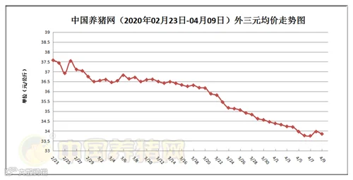 从“2020年04月09日-中国养猪网生猪(外三元)均价走势图”来看,今日我国生猪价格走势不出意料的再次“脚滑”,如此看来昨日猪价上涨不是后市行情向好的信号,仅仅是因猪价连日下跌后,突然的“回光返照”,并不具有连续性。