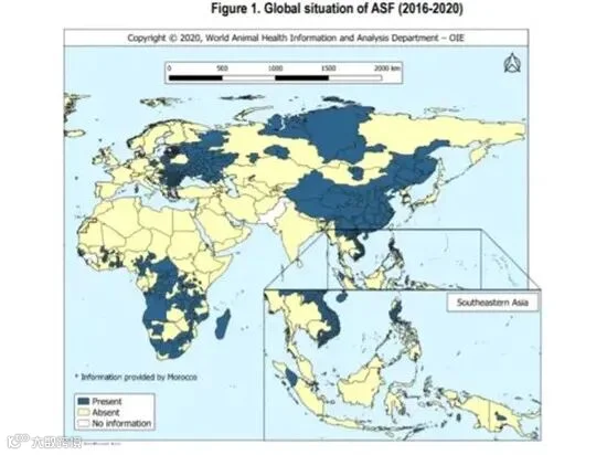 2016—2020年全球分布情况显示,ASF于2018年首次在中国发生后,主要在欧洲和亚洲传播。