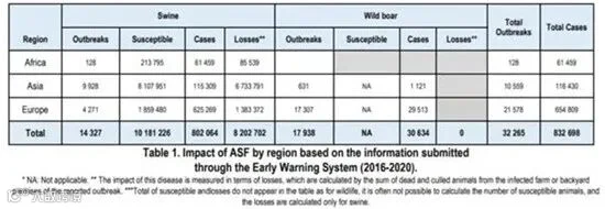 在区域层面观察到了重要的区域差异。非洲国家只报告了猪的疫情,亚洲主要是猪,而欧洲主要是野猪。这些数据对应了非常不同的流行病学情况。