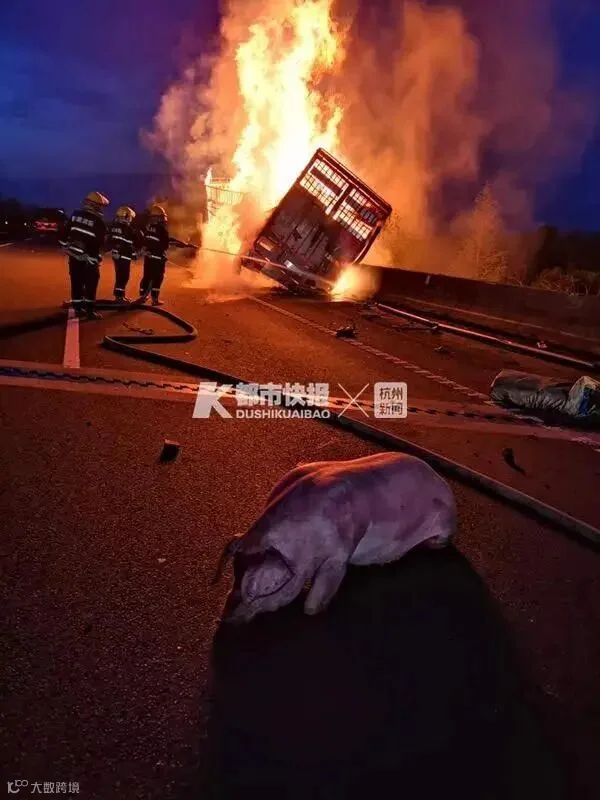 4月6日清晨,一辆从山东开往宁波的半挂拉猪货车在高速上起火,91头猪被烧死熏死,仅余一头存活。