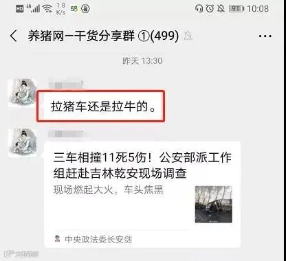 这一事故在中国养猪网官方微信群内也引发讨论,有一猪友表示,该起事故中有一辆是拉猪车或是拉牛车,从视频中我们隐约也可以看出该位猪友消息的可信度,但因官方还未通报调查结果,所有“知情人消息”都不还能完全相信。