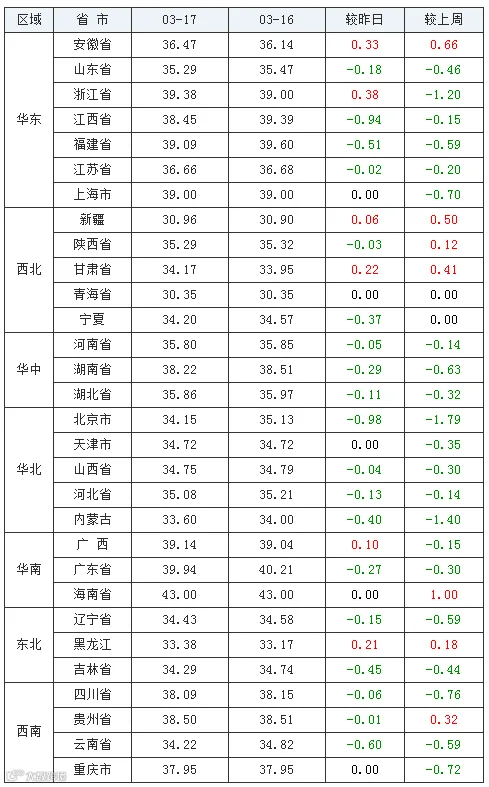 从“中国养猪网2020年3月17日外三元均价涨跌表”来看,华东地区猪价维持在35.29-39.00元/公斤,浙江省与安徽省猪价略微上涨,其余地区呈现明显跌势;西北地区猪价维持在34.20-35.29元/公斤,相对而言猪价普遍不高,涨跌互现;