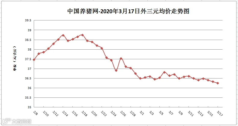 从“中国养猪网2020年3月17日外三元均价走势图”来看,3月以来生猪价格在36.00-37.50元/公斤,猪价行情维持平稳,左右不过相差1.00元/公斤。3月后期猪价走势或将维持现有走势,猪价行情不温不火,但实质上还是处于高位,养猪人满意度尚可。