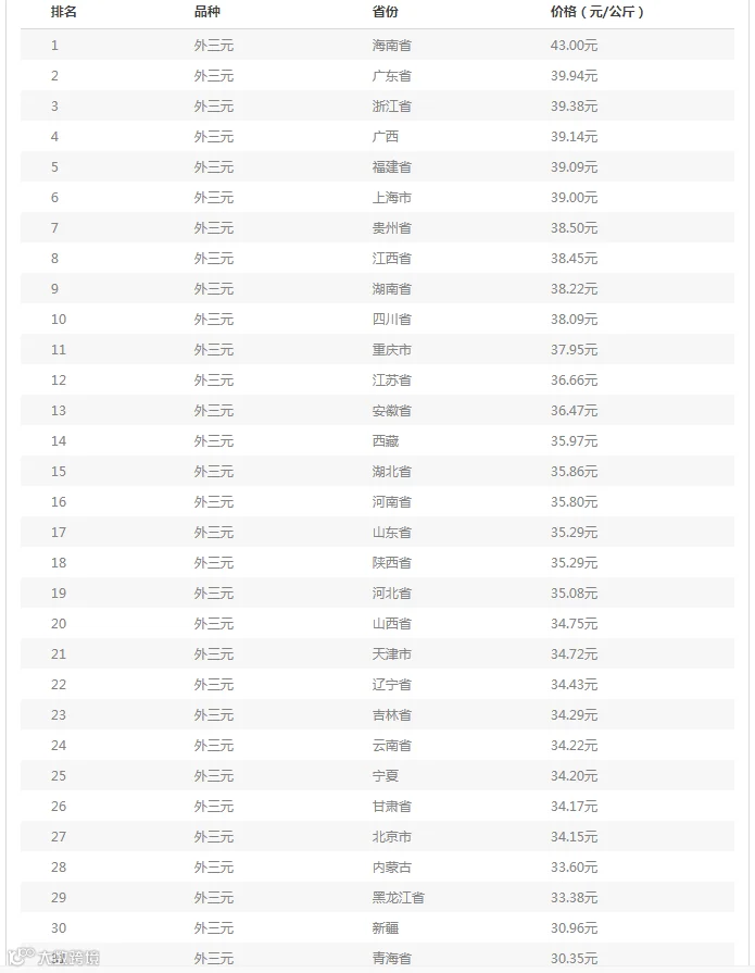 全国外三元均价前五:海南省43.00元/公斤、广东省39.94元/公斤、浙江省39.38元/公斤、广西壮族自治区39.17元/公斤、福建省39.09元/公斤。