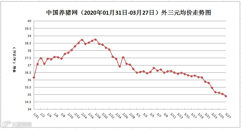 从“2020年03月27日-中国养猪网生猪(外三元)均价走势图”来看,猪价不但从36.50元/公斤跌到了35.00元/公斤,现在还往34.00元/公斤发展了,且跌势没有丝毫缓和的现象,这和我们之前预测的猪价下跌会持续到月底的分析观点一致,现在看来4月的猪价没有上涨基础,会在下跌中保持一个稳定的走势!