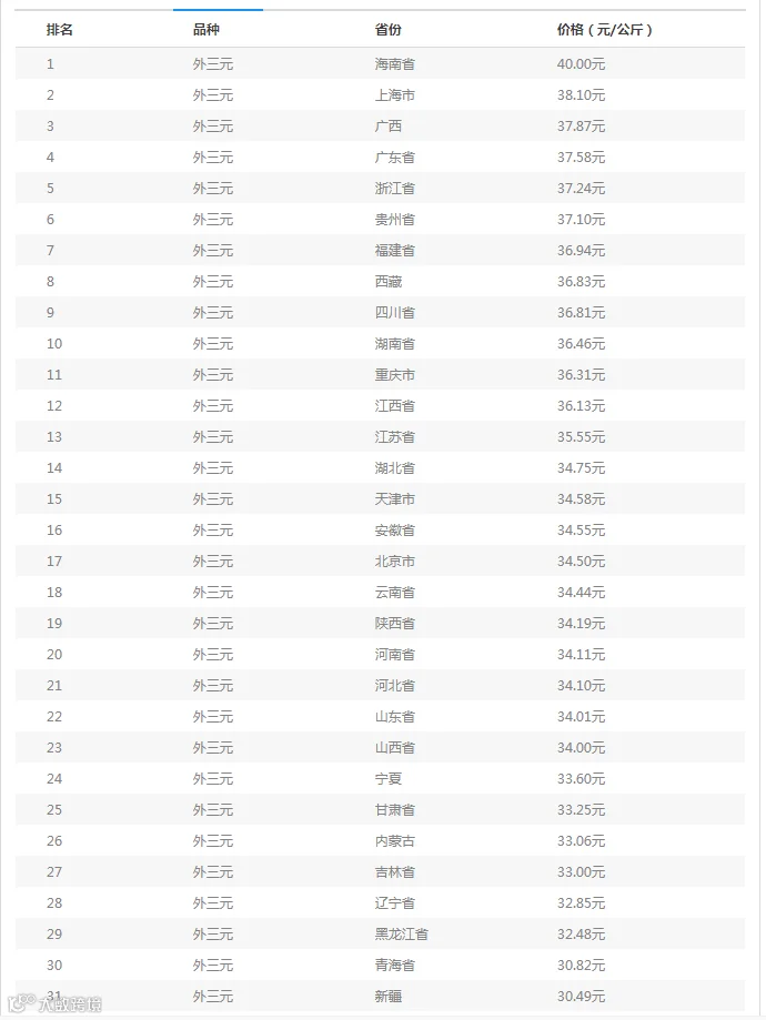 外三元均价排行榜