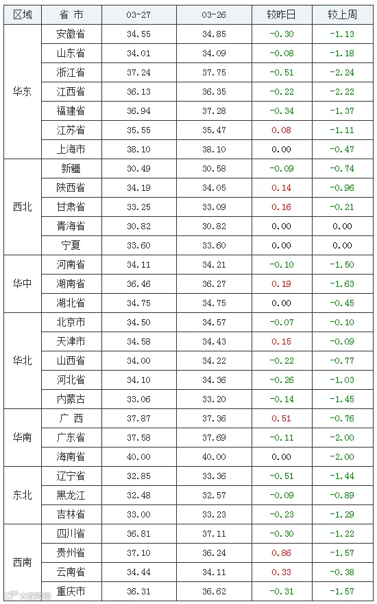 从“2020年03月27日-中国养猪网生猪(外三元)均价涨跌表”来看,江苏省、陕西省、甘肃省、湖南省、天津市、广西壮族自治区、贵州省、云南省等地猪价上涨,涨幅维持在0.08-0.86元/公斤。而全国的其他地区猪价均较昨日没有变化或是下跌,跌幅在0.09-0.51元/公斤,今日猪价仍是涨跌互现,但是较上周相比,全国猪价无一例外下跌,全部飘起“绿旗帜”!