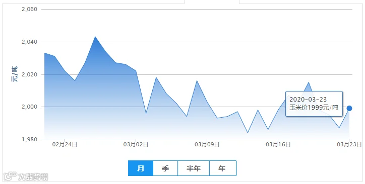 3月23日,全国玉米均价为1999元/吨,较昨日上涨12元/吨。玉米均价前五地区:贵州省2200元/吨、云南省2196元/吨、四川省2144元/吨、湖南省2138元/吨、重庆市2123元/吨。