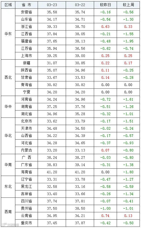 3月23日,中国养猪网猪价系统数据监测显示,全国外三元生猪均价为35.46元/公斤,生猪均价较昨日(3月22日)下跌0.35元/公斤,较上周(3月16日)下跌0.87元/公斤,今日猪价下跌小幅度有所增多,全月跌幅也开始增多,据统计3月份猪价已经累计下跌了1.04元/公斤,前段时间下跌都是几分几分的跌,如今下跌是几毛几毛的跌,虽然本质上近期猪价维稳,但累积之后养猪人需要警惕了。