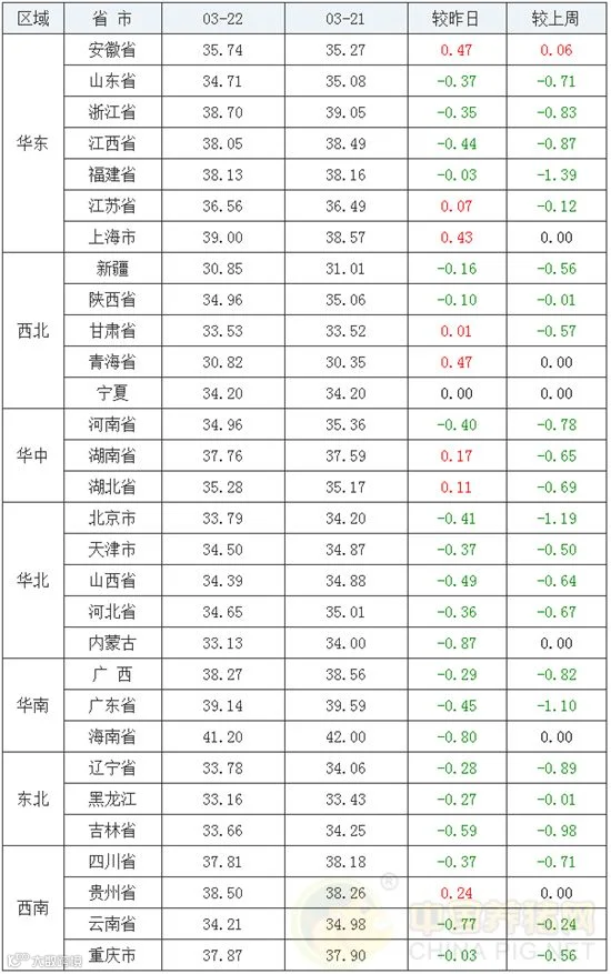 3月22日,中国养猪网猪价系统数据监测显示,全国外三元生猪均价为35.81元/公斤,生猪均价较昨日(3月21日)下跌0.07元/公斤,较上周(3月15日)下跌0.60元/公斤,今日猪价跌幅较前几日相当,截止到目前,3月份已经累计下跌了0.69元/公斤,其跌幅虽然较小,但整体猪价目前无利好支撑其上涨,猪市行情平淡无奇。