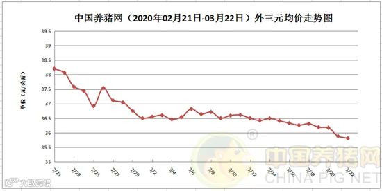 从“2020年03月22日-中国养猪网生猪(外三元)均价走势图”来看,近期一个月的走势处于“静如止水”之状态,虽整体猪价呈下跌趋势,但下跌速度缓慢,国内大部分地区均以涨涨跌跌为主旋律运行。
