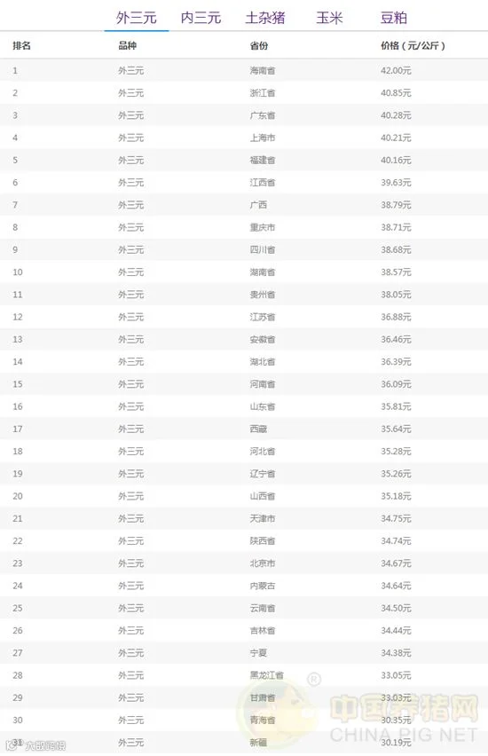 今日最高省份:海南省外三元均价为42.00元/公斤;