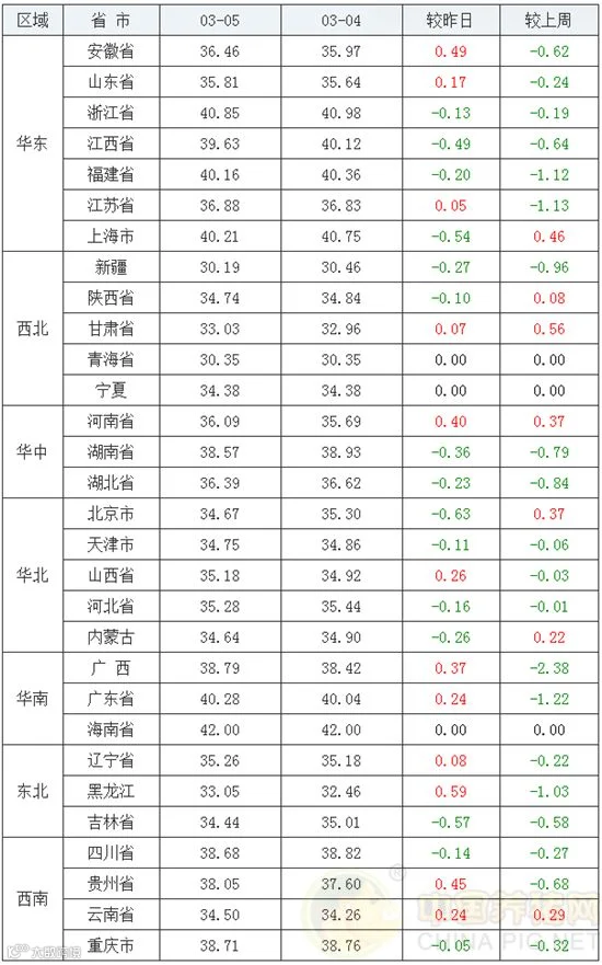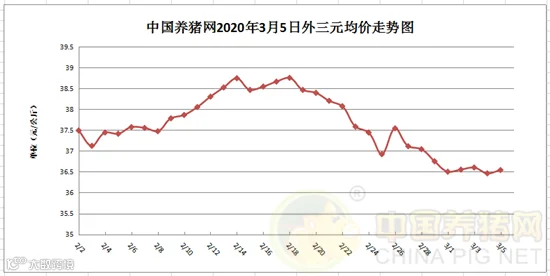 2020年3月5日,据中国养猪网猪价系统监测,全国外三元均价为36.54元/公斤,猪价较昨日上涨0.08元/公斤,较上周下跌0.57元/公斤。涨幅在0.05-0.59元/公斤,跌幅在0.05-0.63元/斤之间。