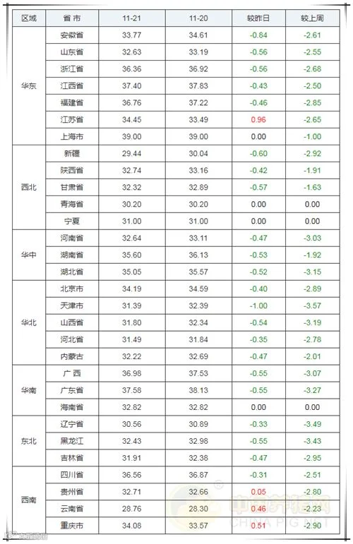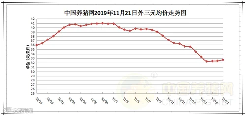 2019年11月21日,据中国养猪网猪价系统监测数据显示,全国生猪均价为32.66元/公斤,价格较昨日报价上涨0.25元/公斤,较上周下跌3.03元/公斤。今日猪价涨幅维持在0.05-0.96元/公斤,今日猪价跌幅维持在0.31-1.00元/公斤。