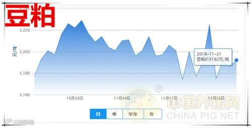 今日全国豆粕均价为3192元/吨,较昨日上涨6元/吨,较上周下跌8元/吨。