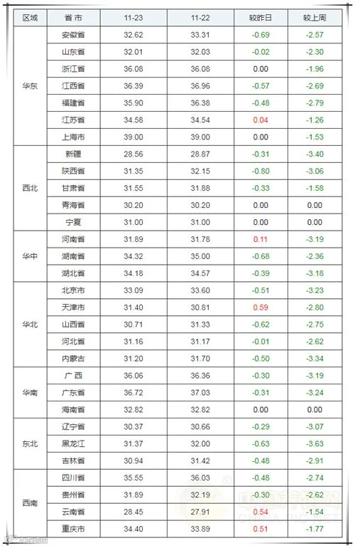 今日最低省份:云南省外三元均价为28.45元/公斤;