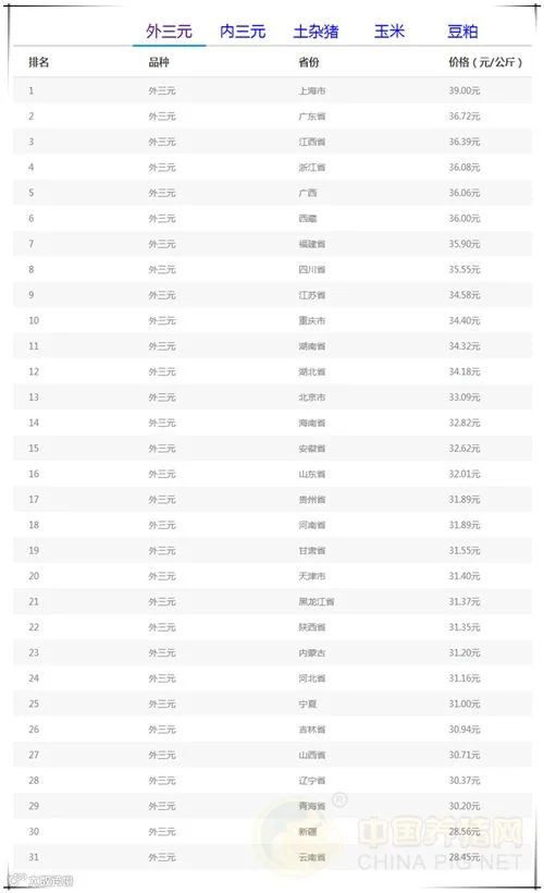 今日最高省份:上海市外三元均价为39.00元/公斤;