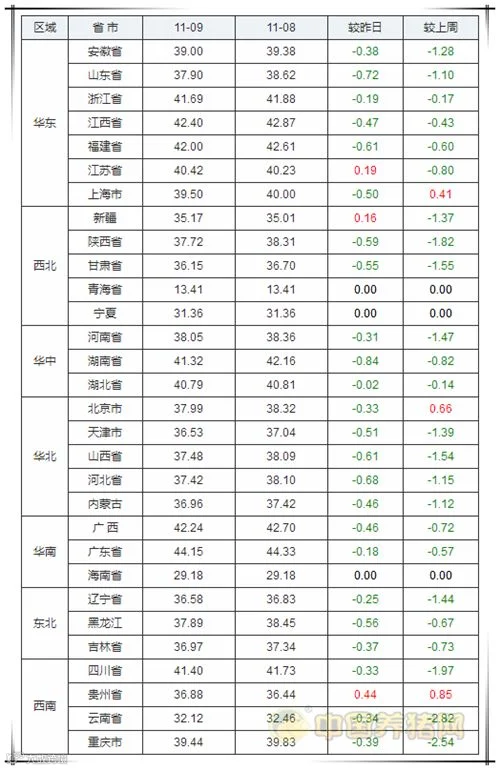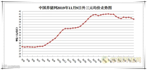 2019年11月9日,据中国养猪网监测全国生猪均价为39.04元/公斤,价格较昨日报价下跌0.44元/公斤,较上周下跌1.02元/公斤。今日猪价涨幅维持在0.16-0.44元/公斤,今日猪价跌幅维持在0.02-0.84元/公斤。
