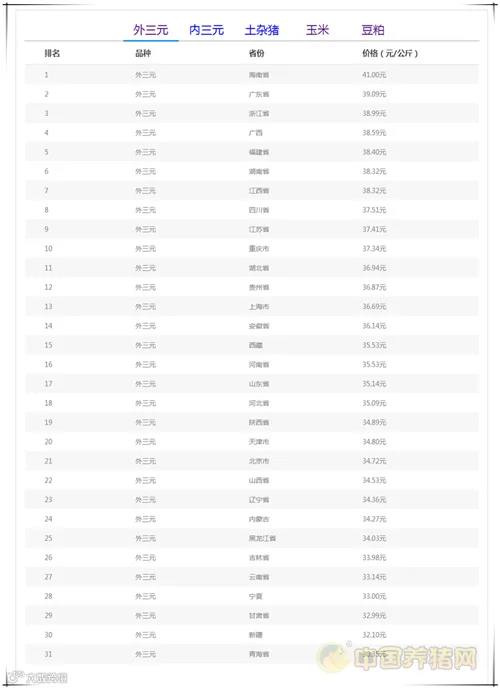 今日最高省份:海南省外三元均价为41.00元/公斤;