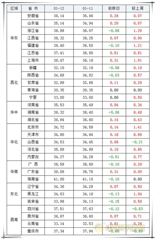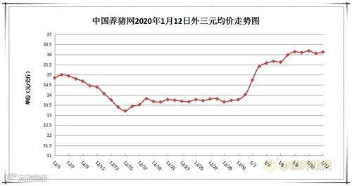 2020年1月12日,据中国养猪网猪价系统监测全国外三元均价为36.13元/公斤,猪价较昨日上涨0.07元/公斤,较上周上涨了0.46元/公斤。涨幅在0.04-0.61元/公斤,跌幅在0.01-0.60元/斤之间。