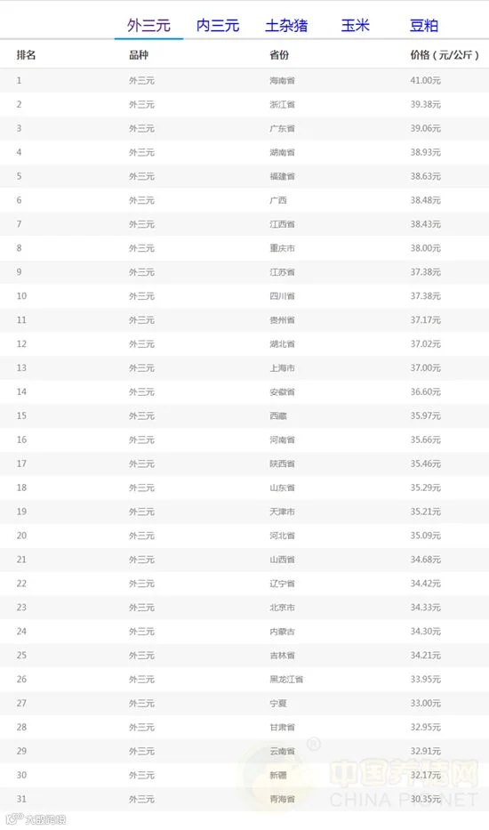 今日最高省份:海南省外三元均价为41.00元/公斤;