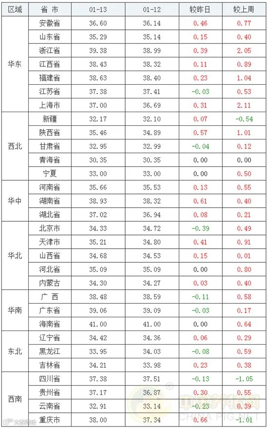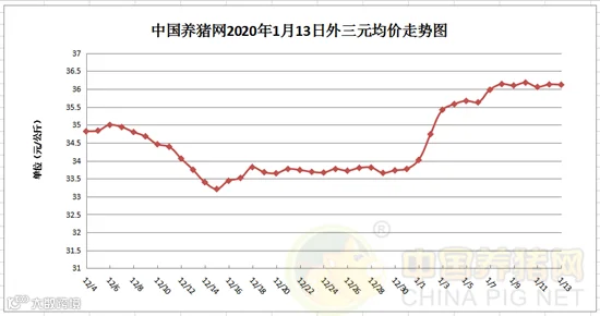2020年1月13日,据中国养猪网猪价系统监测全国外三元均价为36.12元/公斤,猪价较昨日下跌0.01元/公斤,较上周上涨0.49元/公斤。涨幅在0.03-0.66元/公斤,跌幅在0.03-0.39元/斤之间。