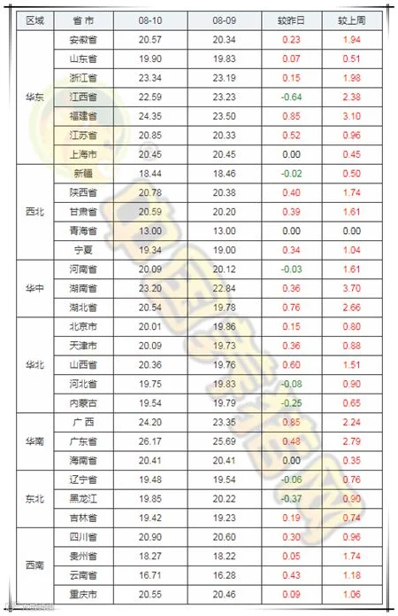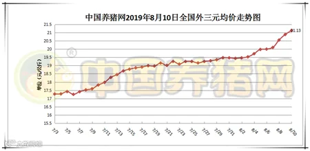 2019年8月10日,据中国养猪网猪价系统监测全国外三元均价为21.13元/公斤,价格较昨日上涨0.24元/公斤,较上周上涨1.60元/公斤。今日猪价涨幅维持在0.05-0.85元/公斤,今日猪价跌幅维持在0.02-0.64元/公斤。