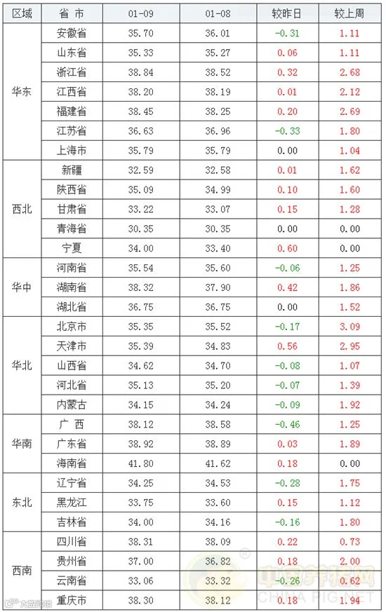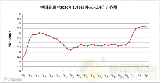2020年1月9日,据中国养猪网猪价系统监测全国外三元均价为36.10元/公斤,猪价较昨日下跌了0.04元/公斤,较上周上涨了1.36元/斤。涨幅在0.01-0.60元/公斤,跌幅在0.06-0.33元/斤之间。